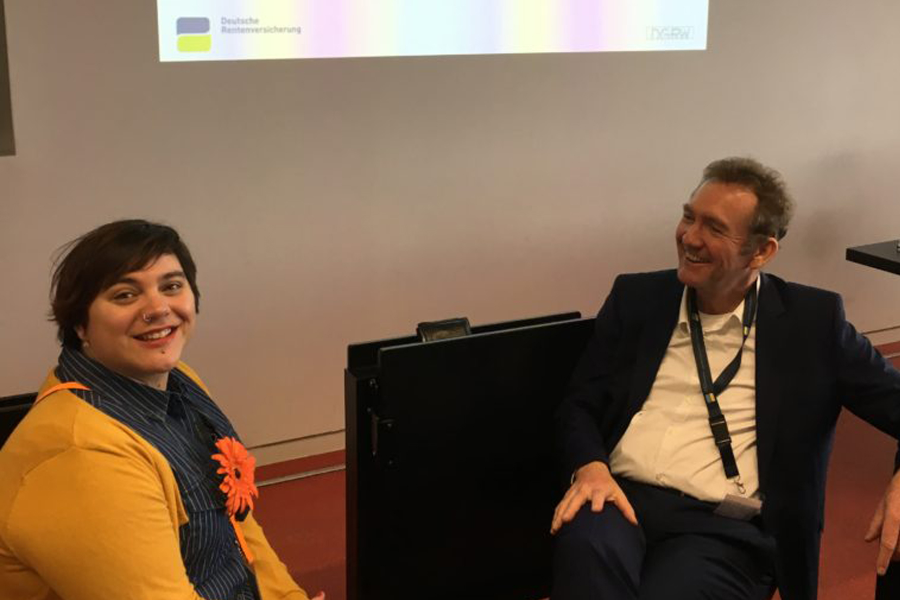 Ulrich Saur, Leitender Arzt, und Dipl. Sozialarbeiterin Christina Rabke vom Rehabilitationshaus in Paderborn präsentieren kurzweilig und anschaulich in einem Rollenspiel die schemazentrierte emotiv-behaviorale Therapie in einem Diskussionsforum auf dem Reha-Wissenschaftlichen Kolloquium der Deutschen Rentenversicherung Bund im Hörsaalzentrum der Goethe Universität in Frankfurt. Dieses stand unter der Thematik: