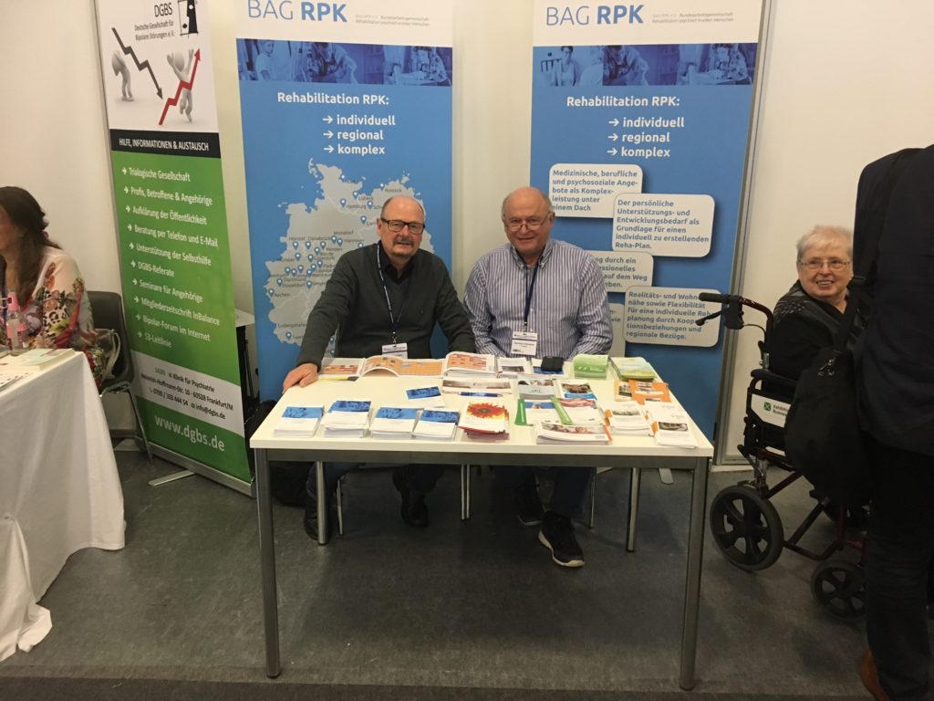 Die Vorstandsmitglieder der BAG RPK (Bundesarbeitsgemeinschaft der Rehabilitationseinrichtungen psychisch kranker Menschen) Johannes Tack vom SPI Paderborn e.V. und Hartmut Fuhrmann vom Club 74 Minden konnten viele interessante Gespräche mit nationalen und internationalen Kolleginnen und Kollegen am Informationsstand der BAG RPK führen.