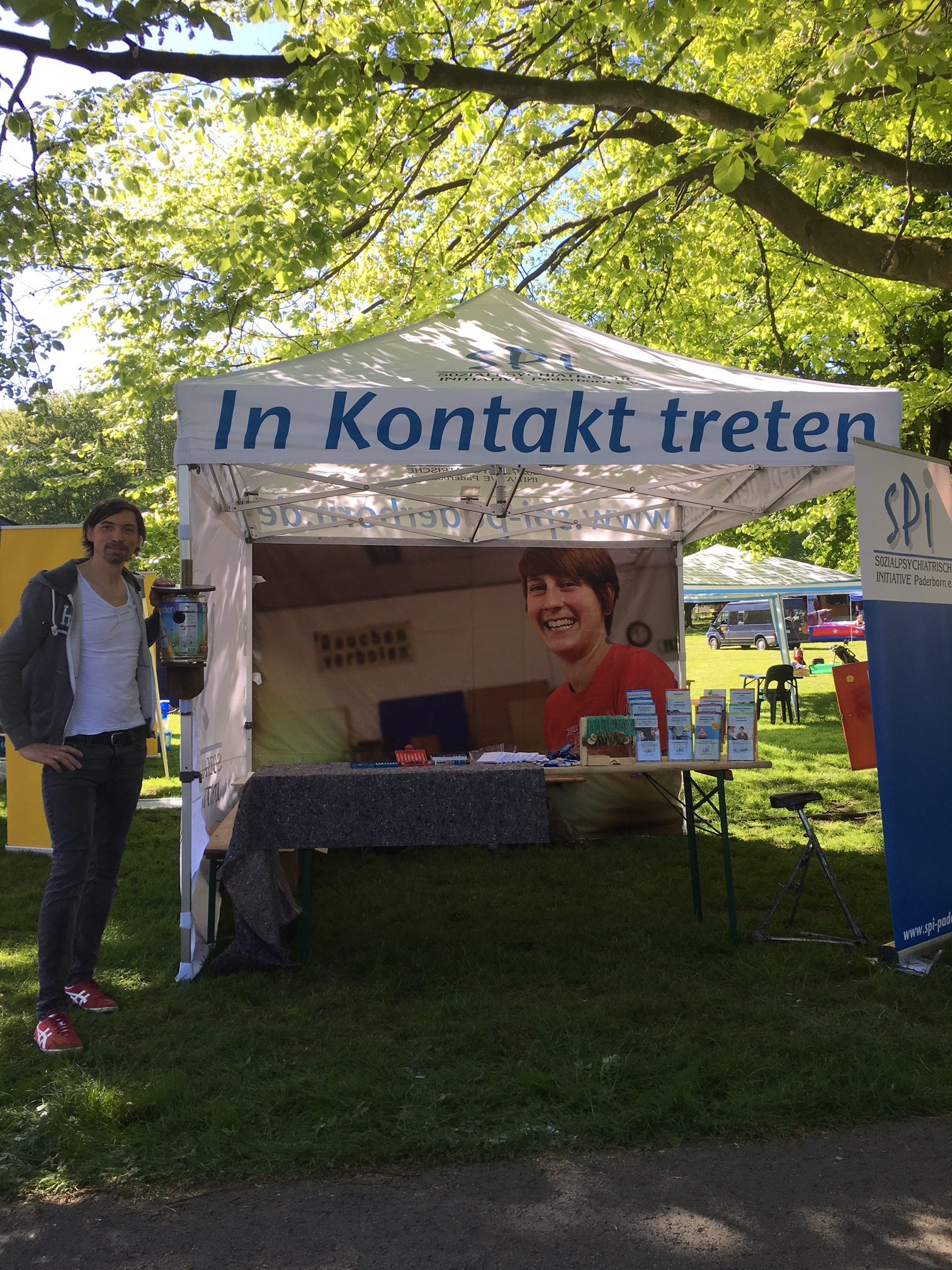 Foto: Bartholomäus Rymek (Leitung BZM) am von ihm entworfenen neuen Infostand des SPI Paderborn e. V.